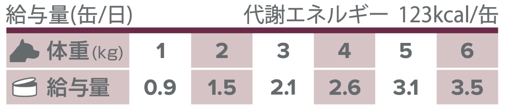 缶詰、パウチ:体重ごとに1日の必要缶数/袋数を表示しています。