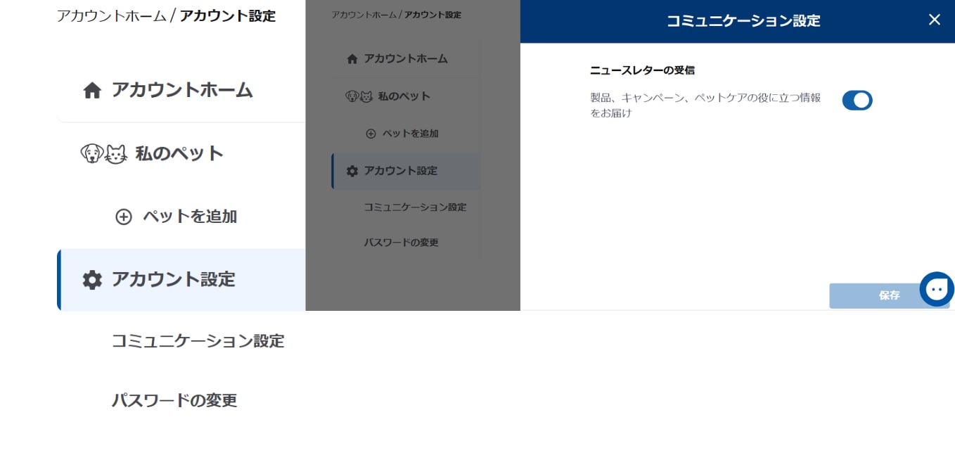 マイアカウントは、ペットの情報を管理したり、ペットオーナーの登録情報を変更管理できる総合的なページです。ペットオーナーは、ペットの成長を追跡したり、パーソナライズされた記事の提案を受け取ったり、アカウントの設定をカスタマイズしたりすることができます。